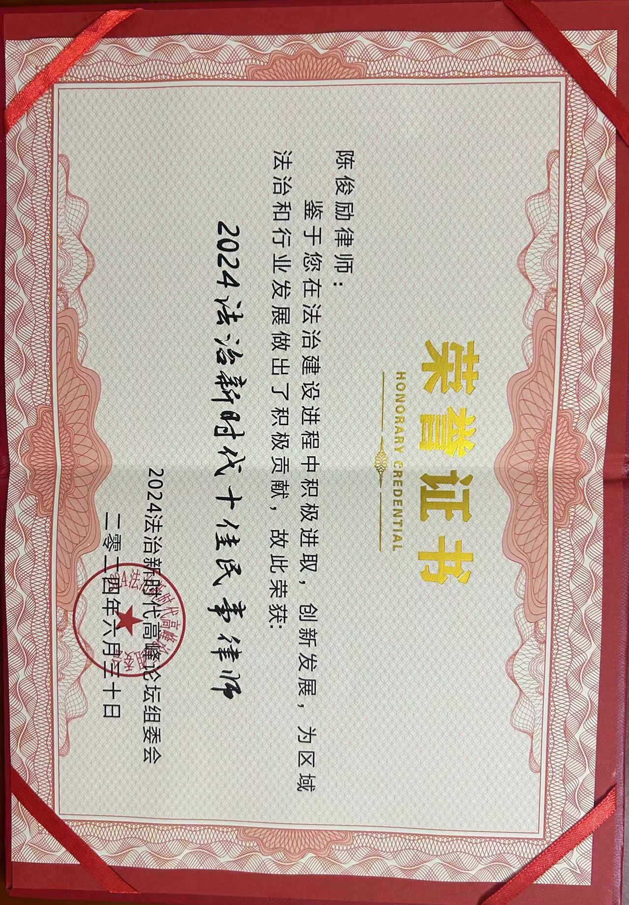 鉴于陈俊励律师在法治建设进程中积极进取,创新发展,为区域法治和行业发展做出了积极贡献,会上,陈俊励律师被授予“2024法治新时代十佳民事律师”称号。